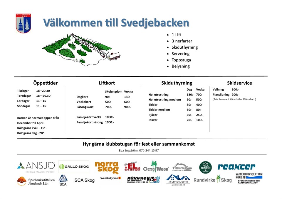 Klubbstuga med servering och öppen spis. Toppstuga med värmekamin och härlig utsikt. Uthyrning av skidutrustning. (Endast kontanter eller swish) Telefon klubbstuga: 0696- 40357 Öppettider Lör & Sön 11.00-15.00 Tis & Tors 18.00-20.30 Vecka 9 & 10: Mån-Sön 11.00-15.00 Tis & Tors 18.00-20.30 Köldgräns kväll -15° Köldgräns dag -20° Kälarne IK 12 feb 2024 0kommentarer